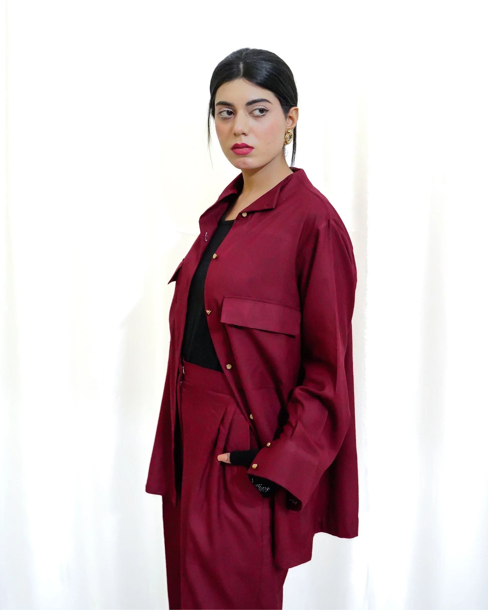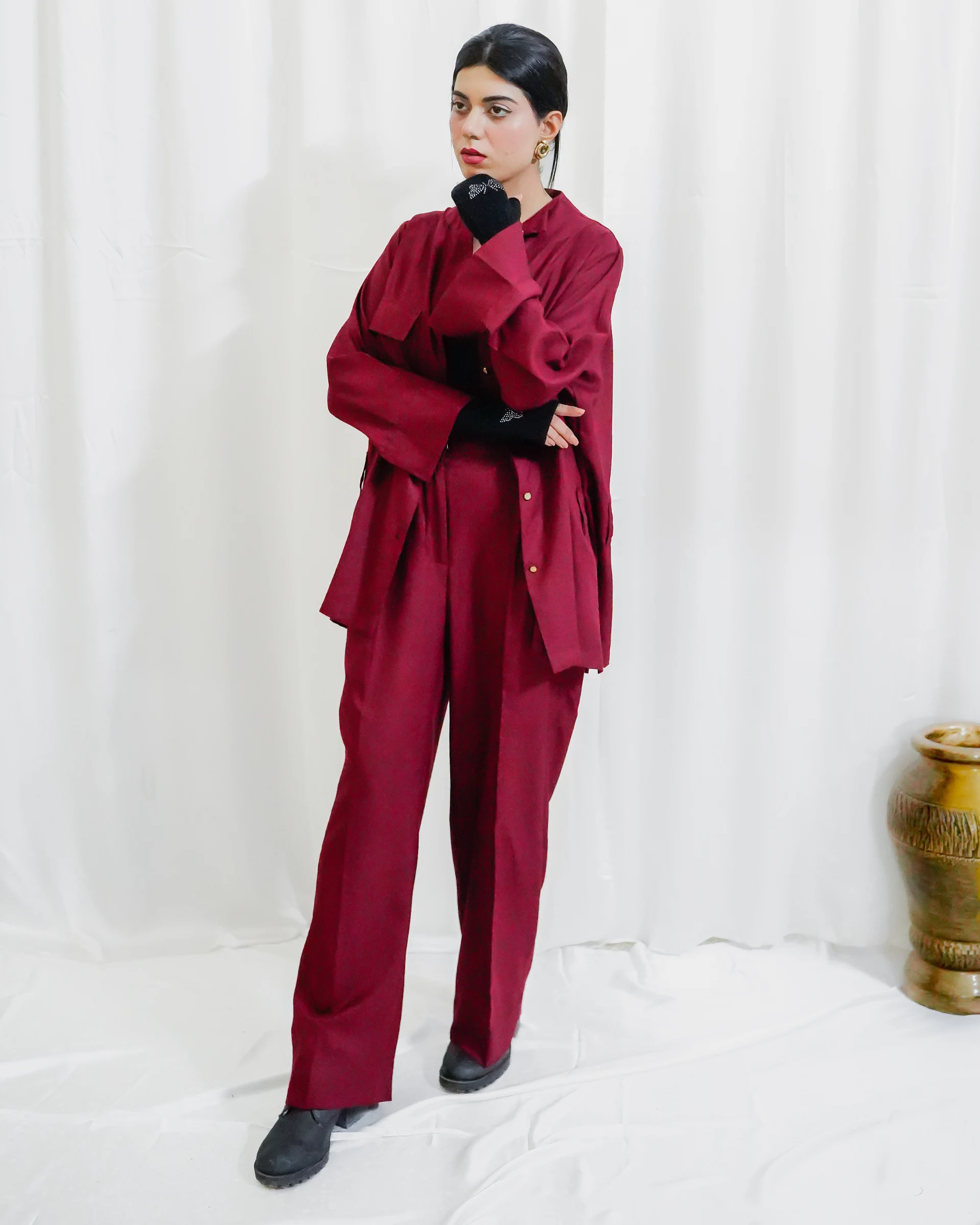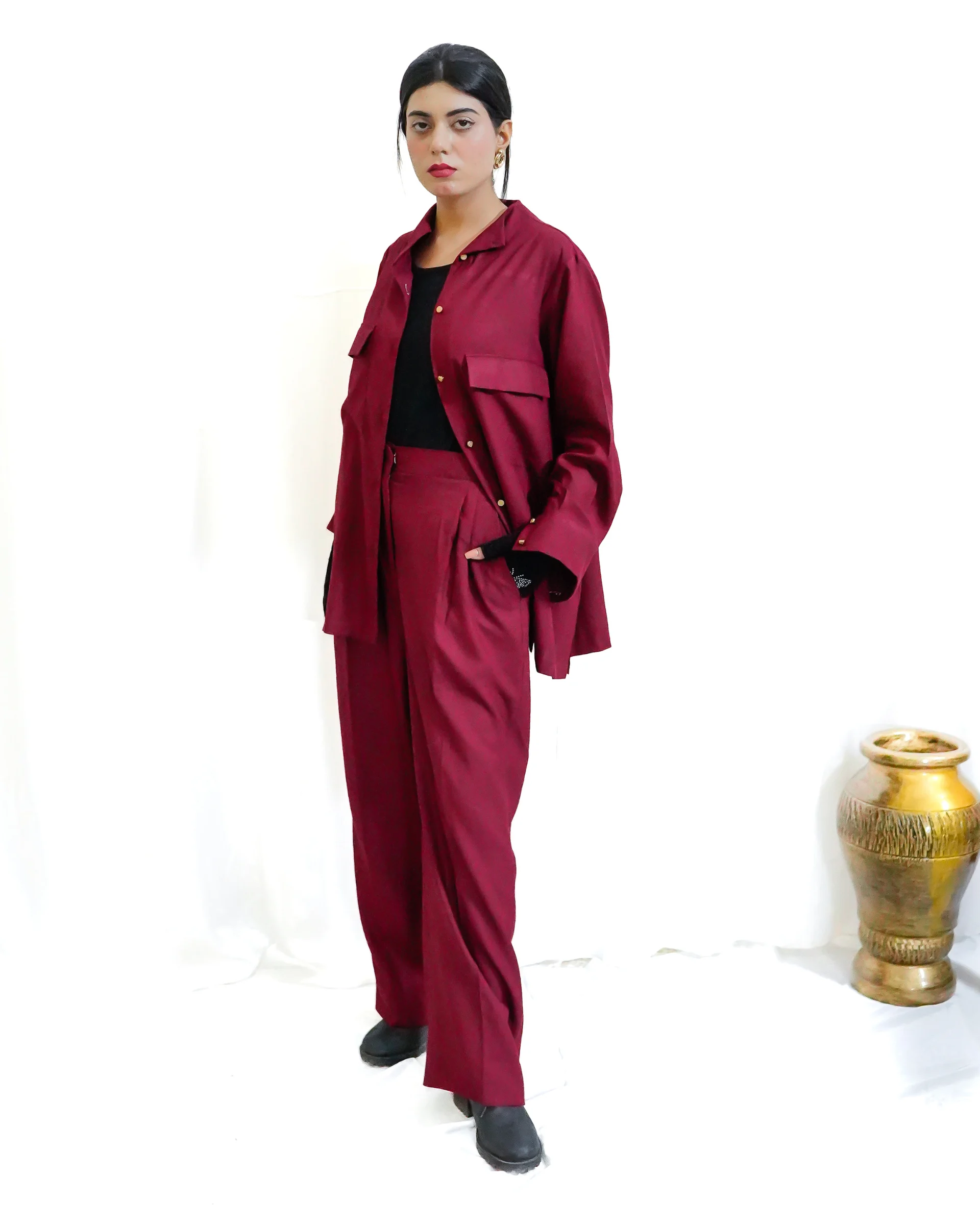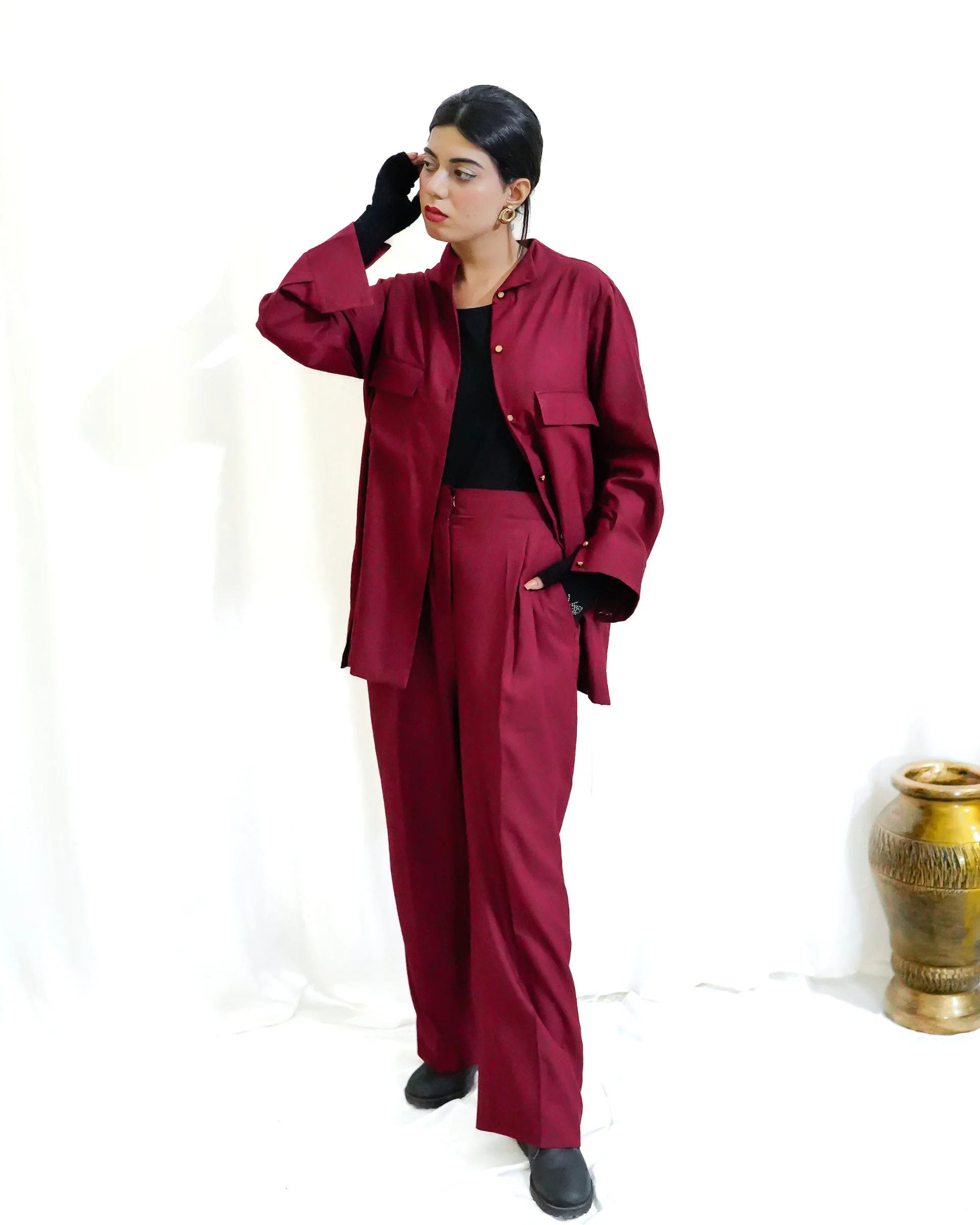 A deep red co-ord set crafted from rich Dhanak Marina fabric with clean, refined tailoring.