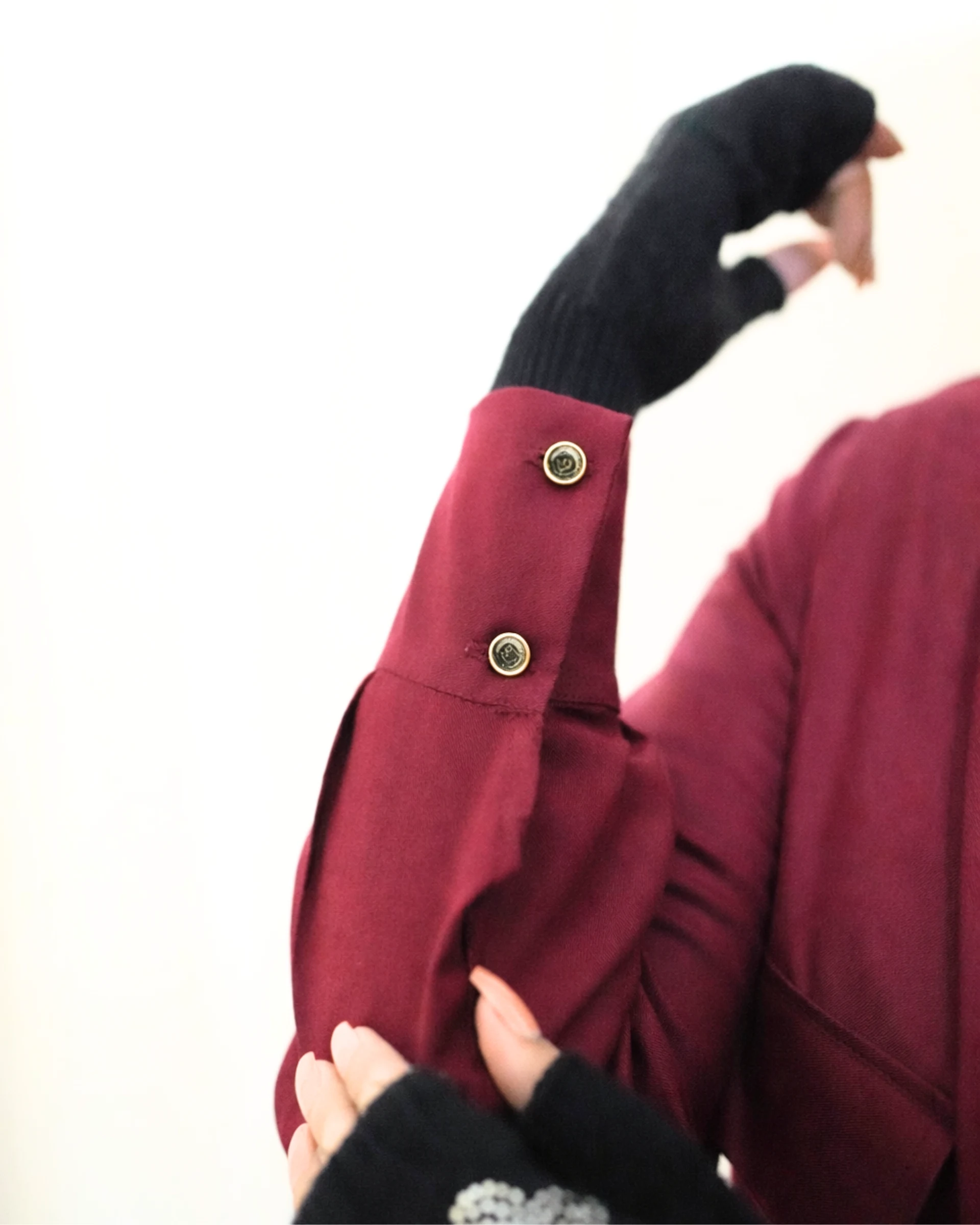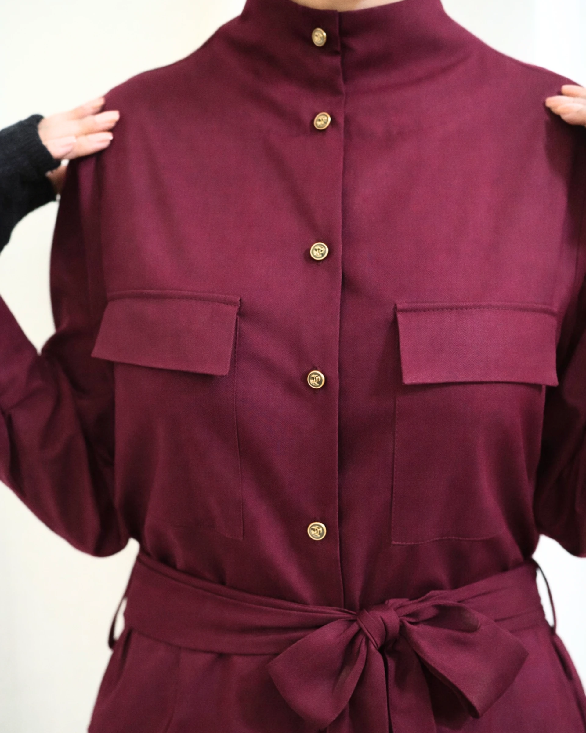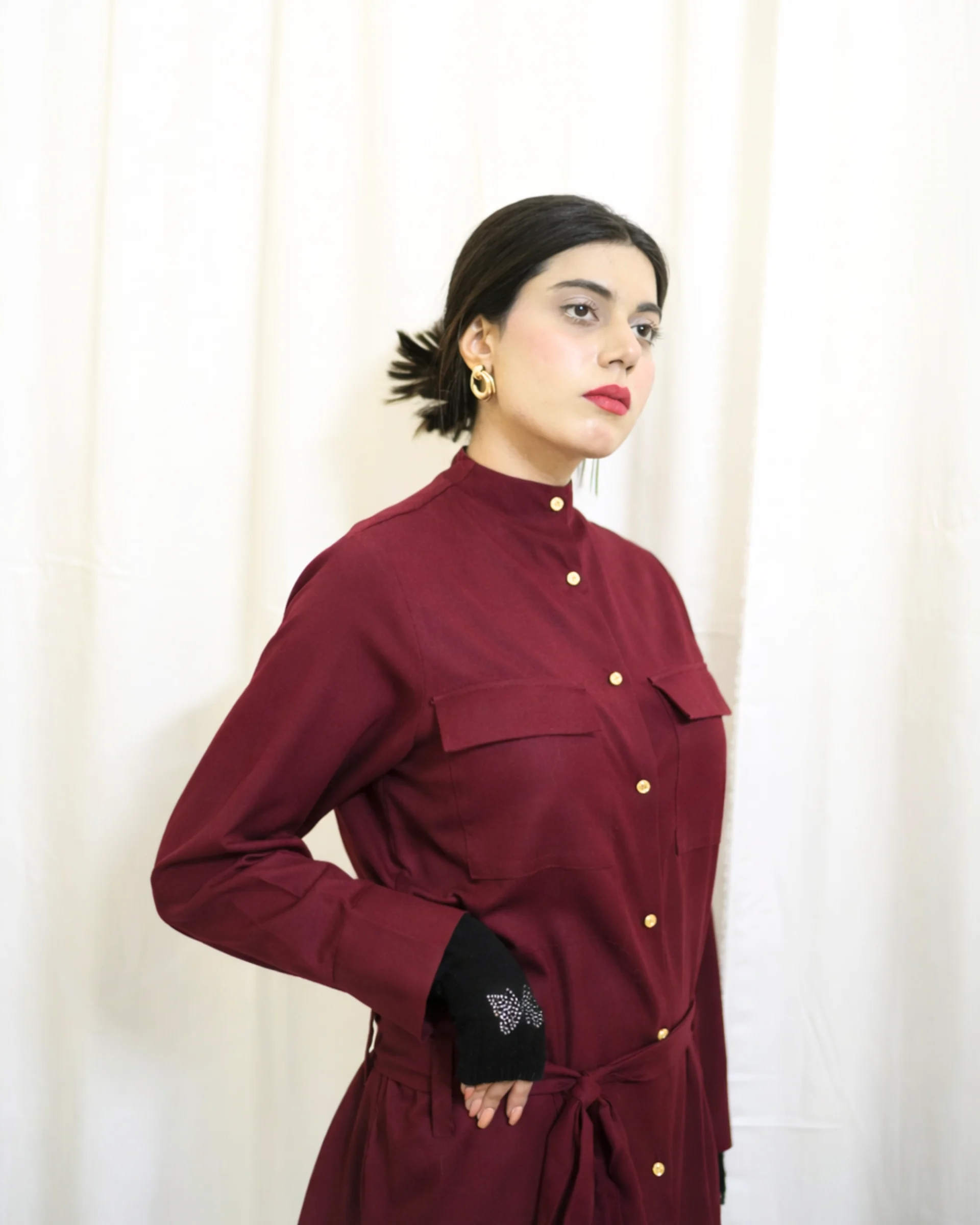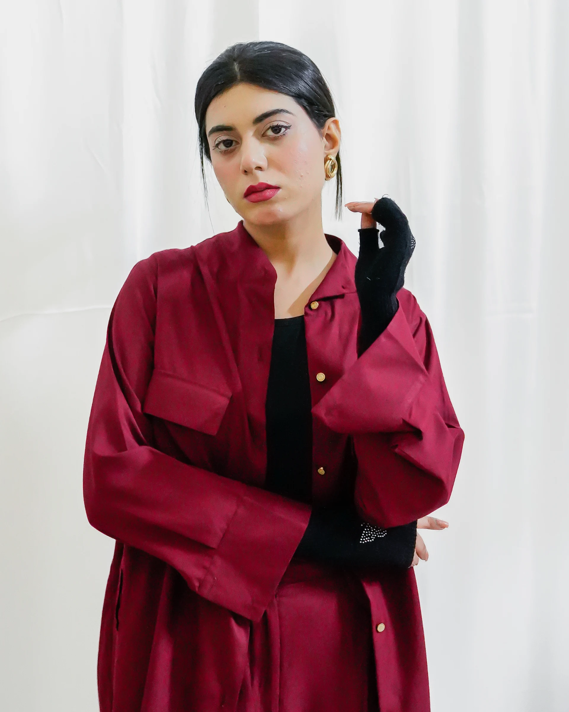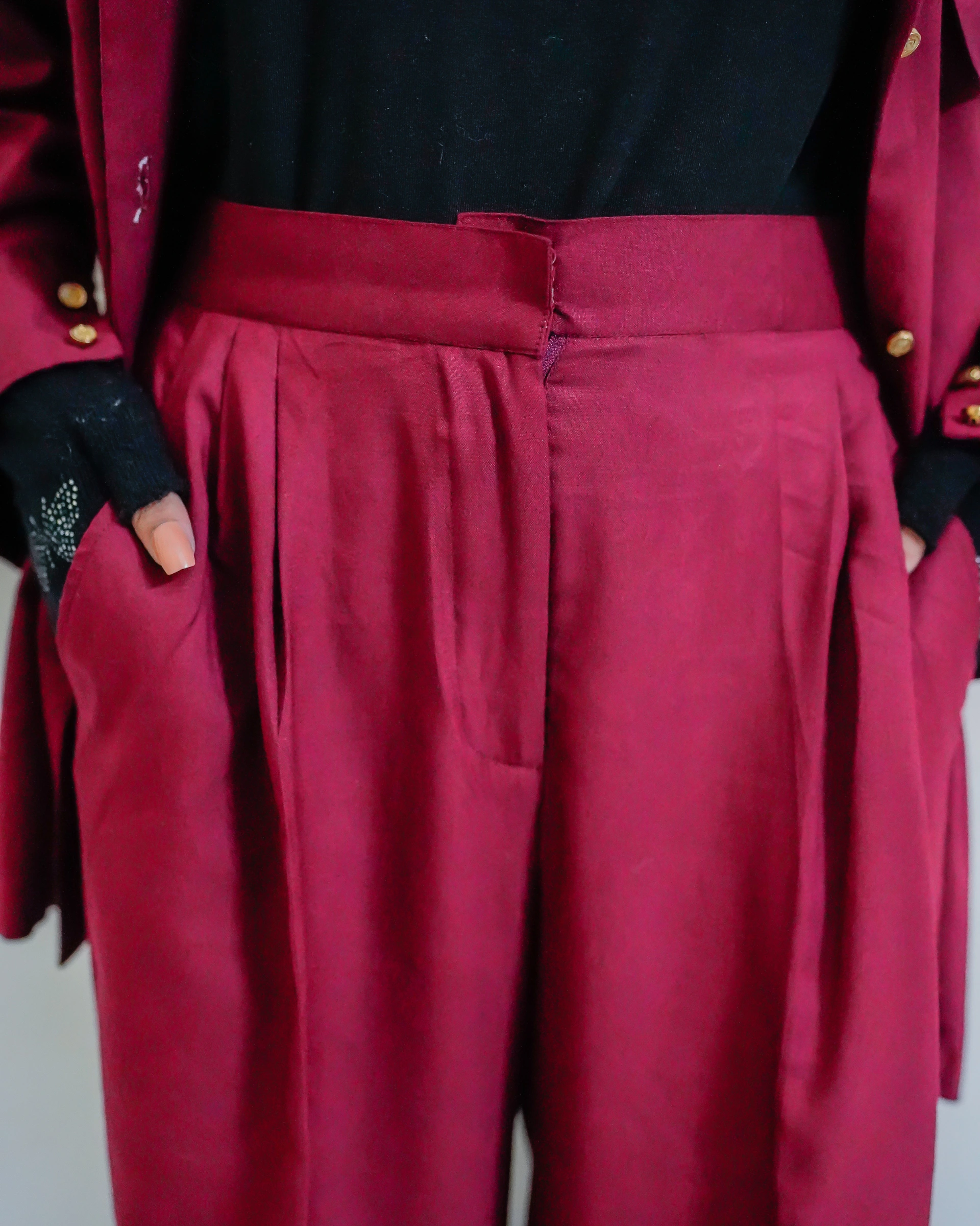 A deep red co-ord set crafted from rich Dhanak Marina fabric with clean, refined tailoring.