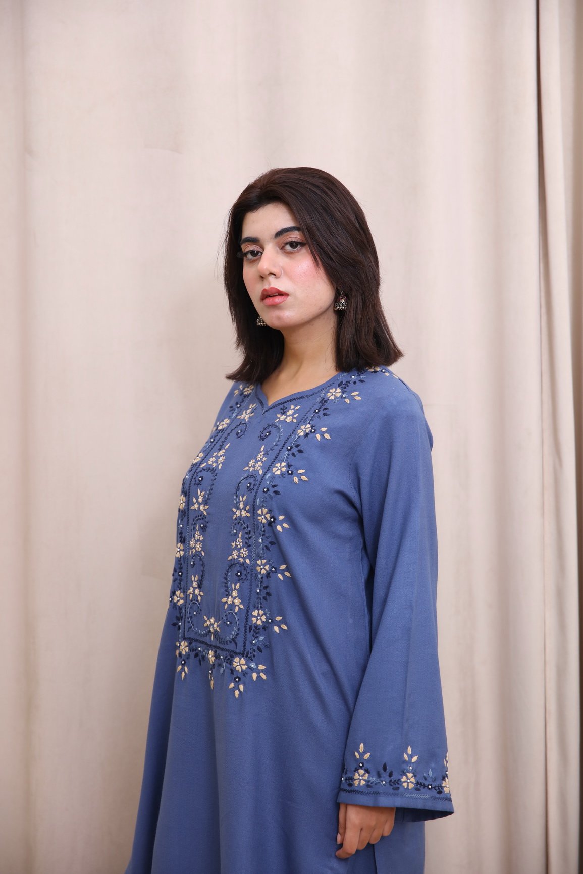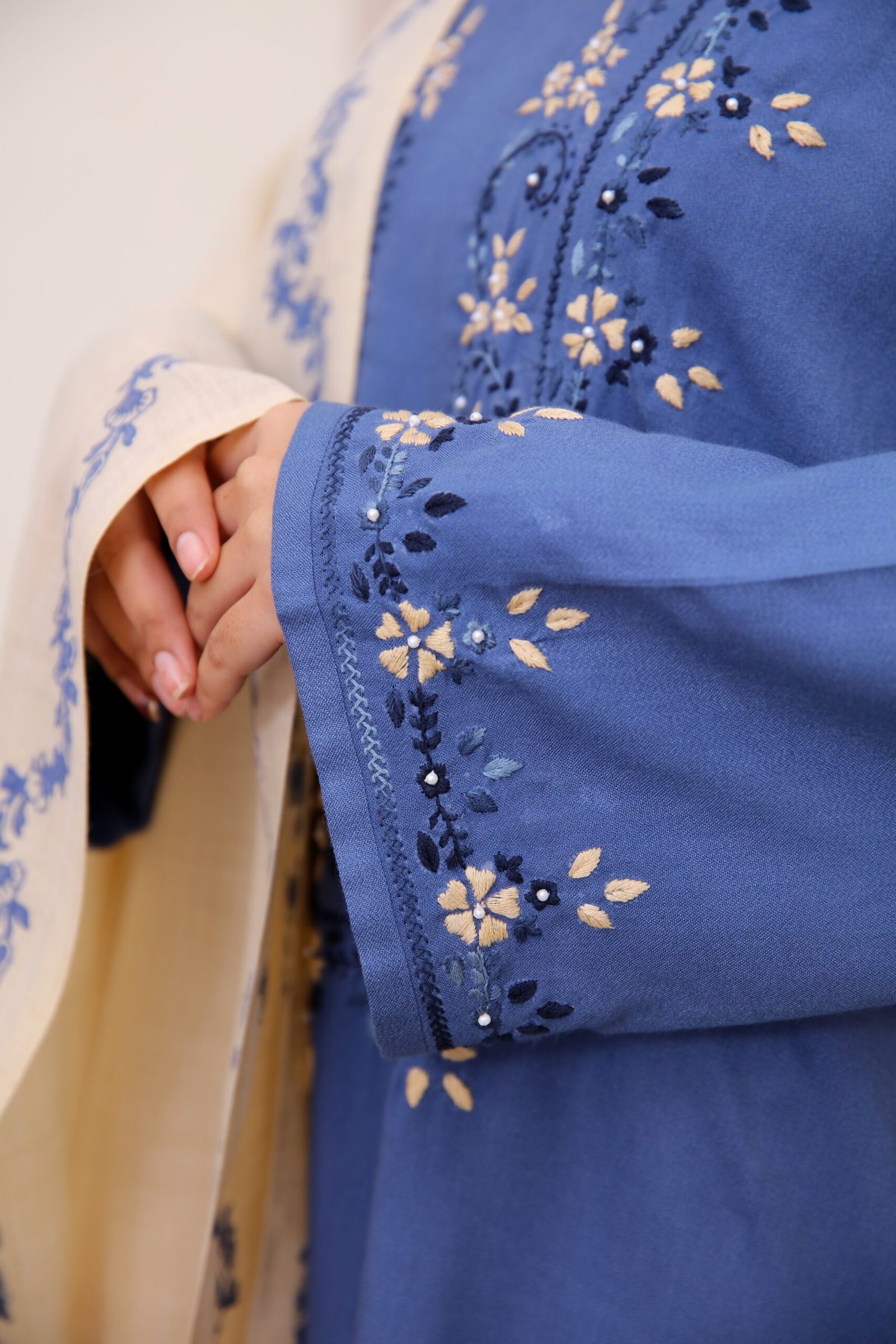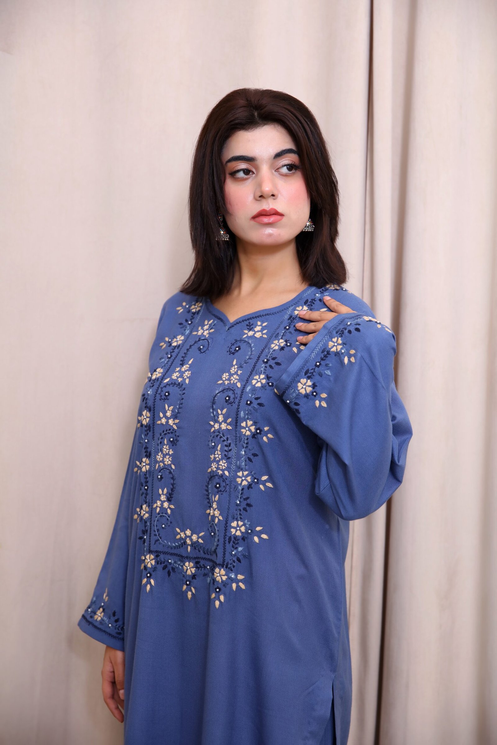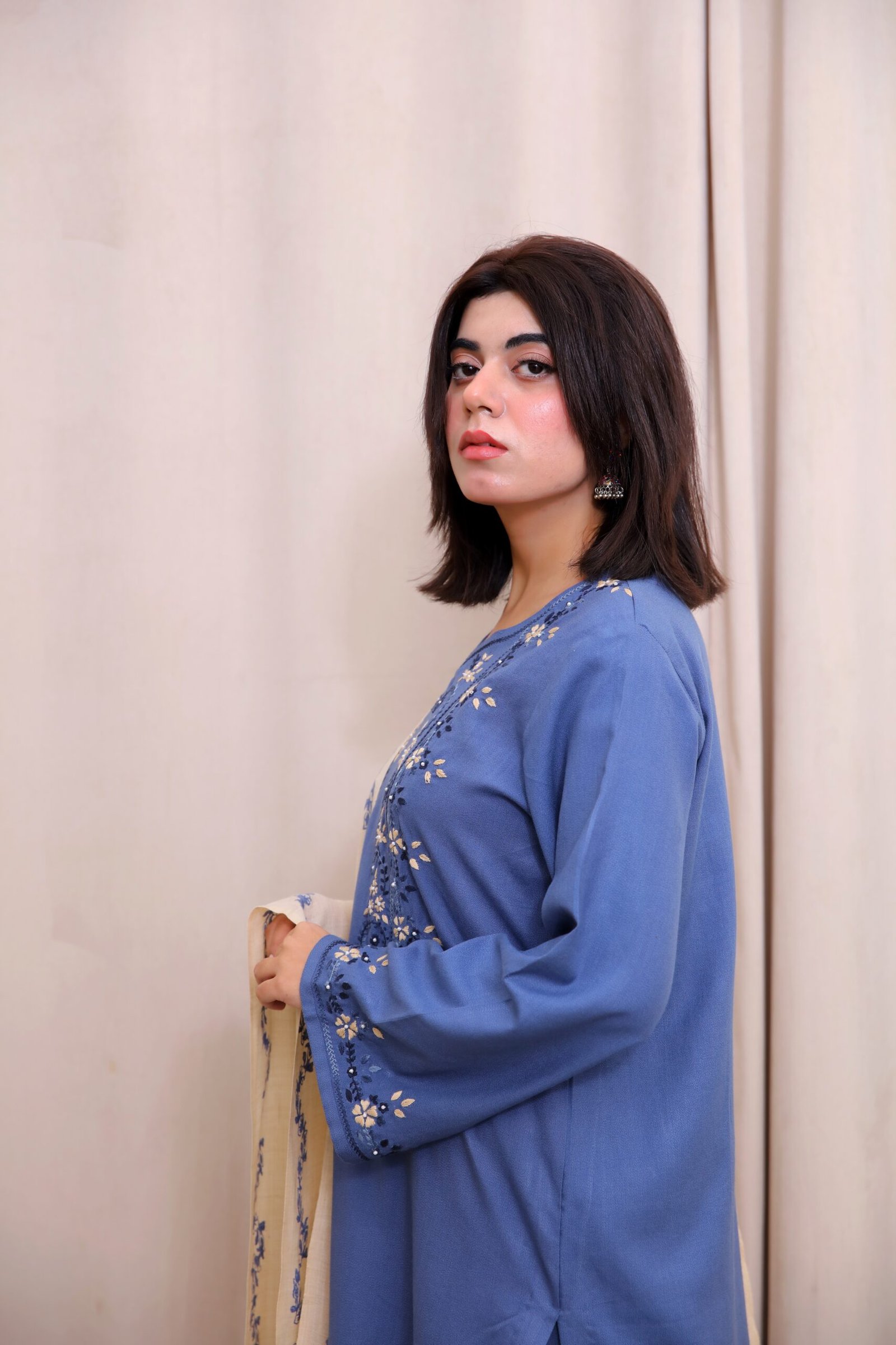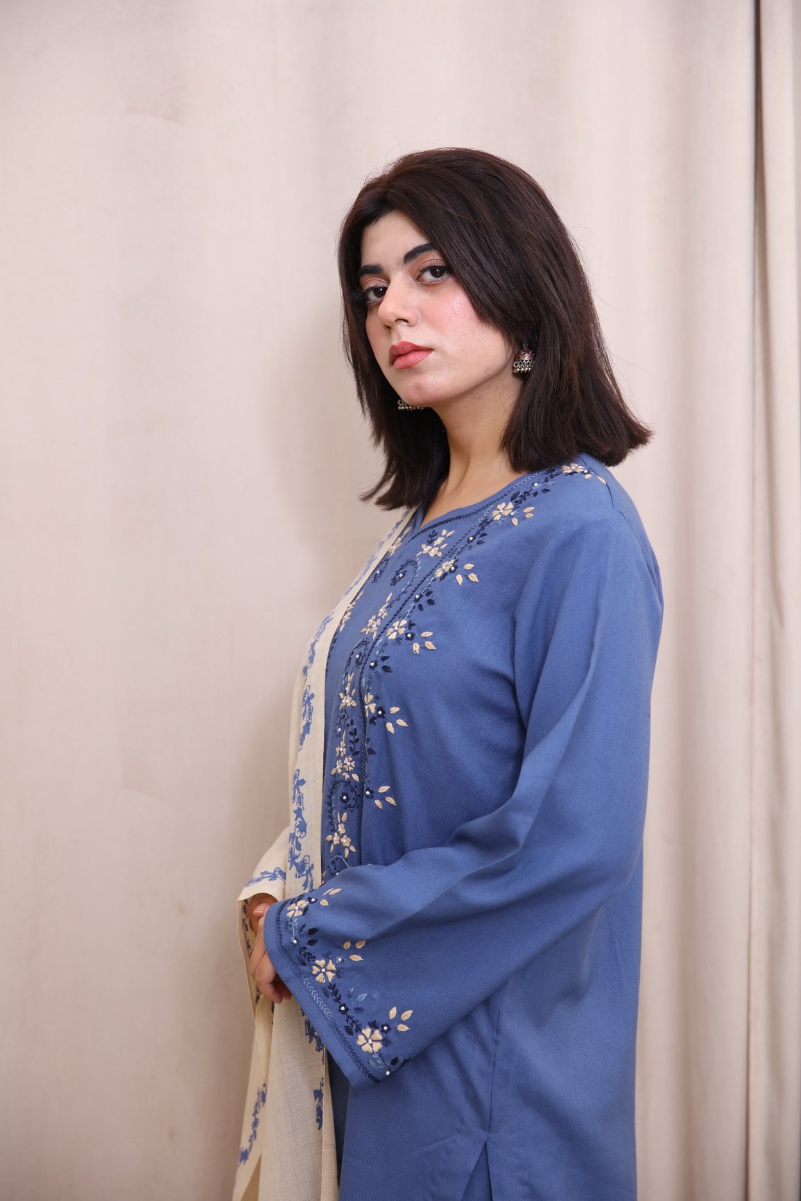 - Embroidery is crafted in soft blue, grey and beige color and embellished with small white pearls