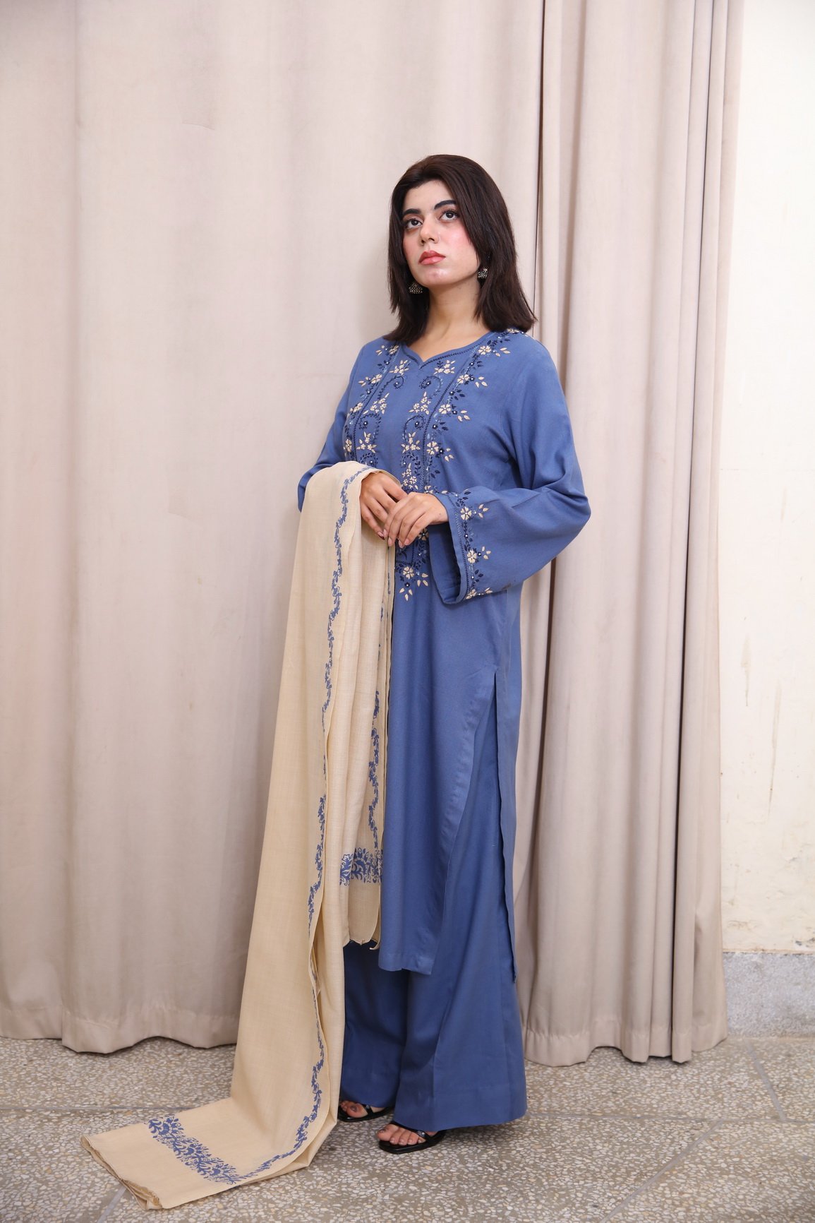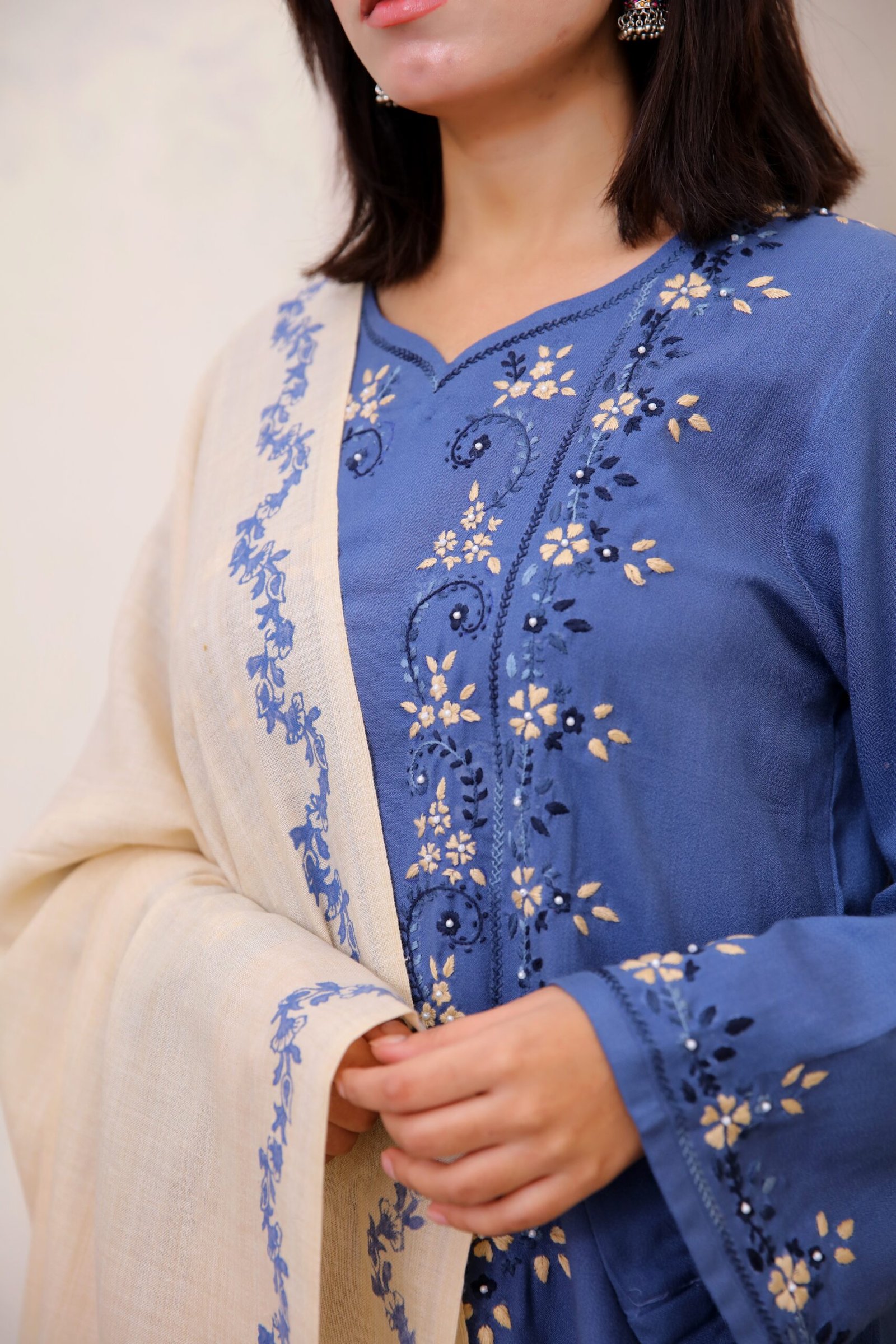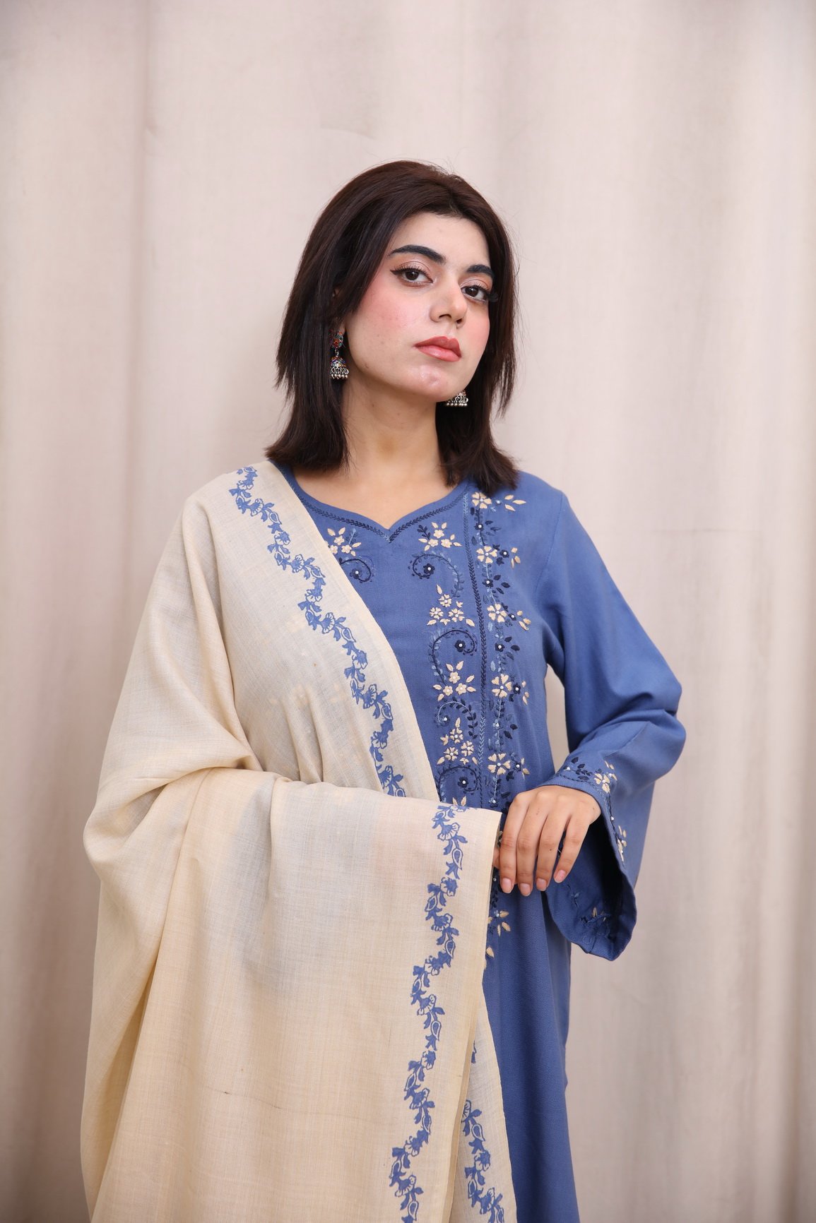 This elegant three-piece suit is crafted in dusty slate blue tone, which has a soft and muted appearance. The article is paired with a soft beige shawl with block prints along borders and length.Â