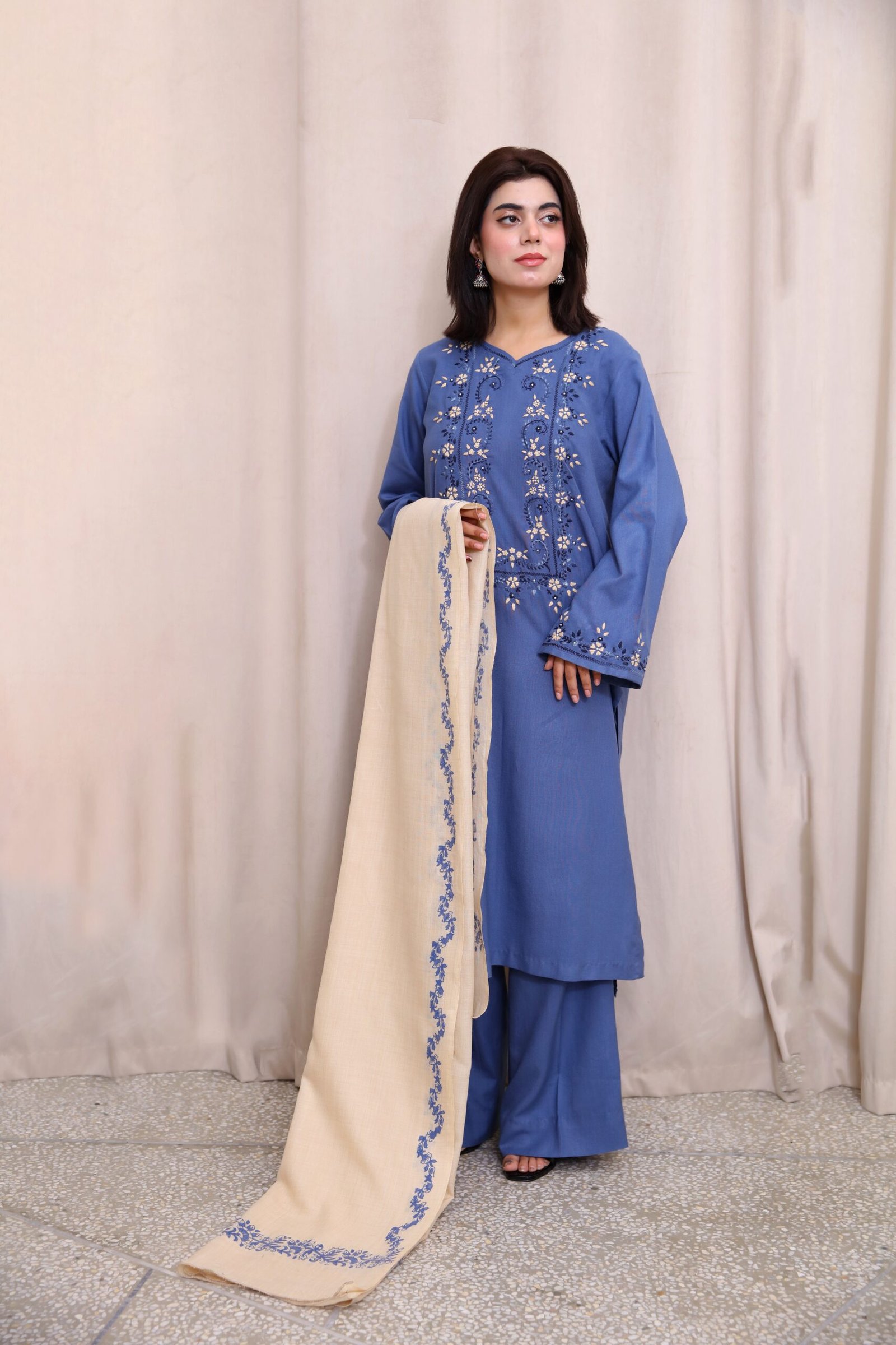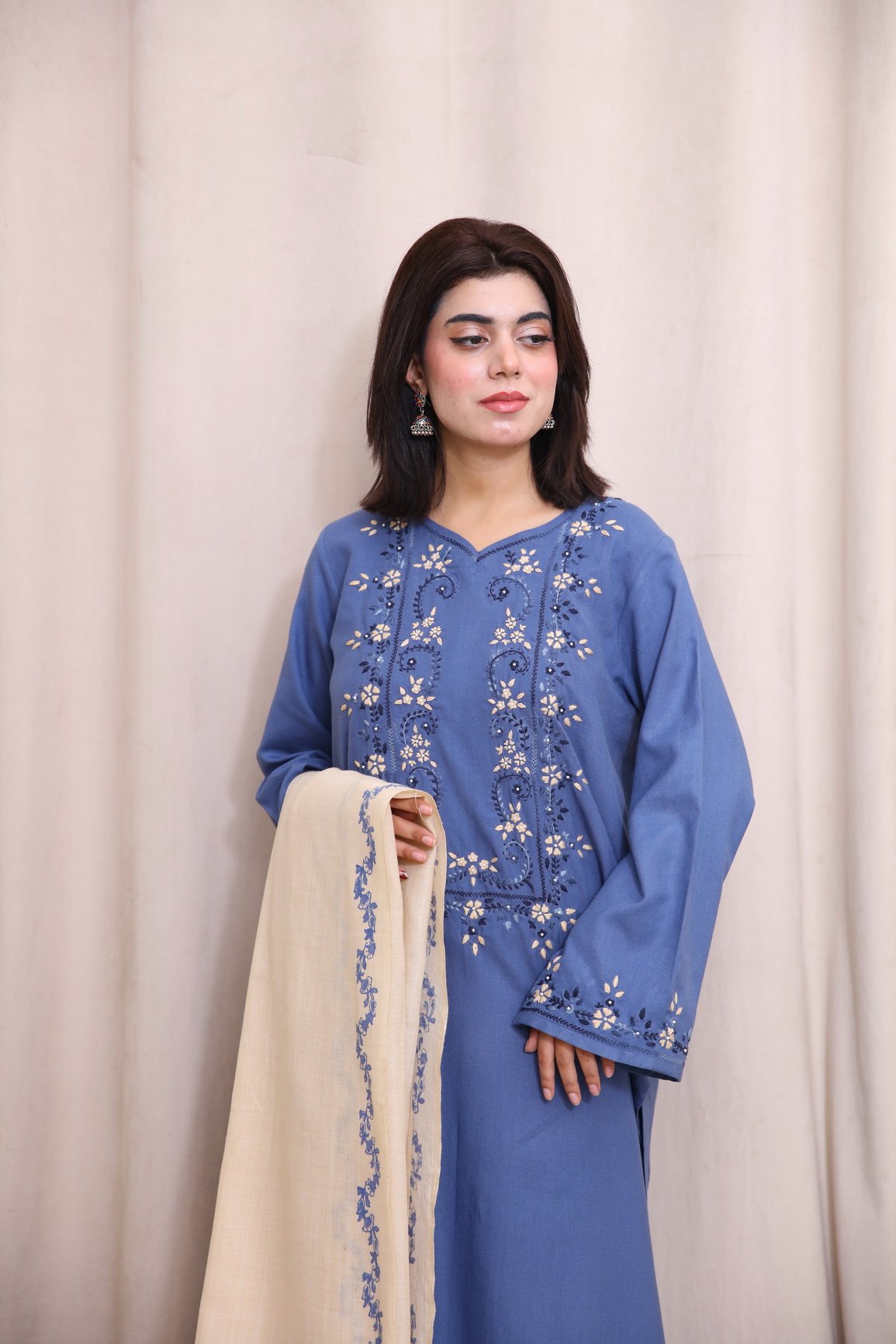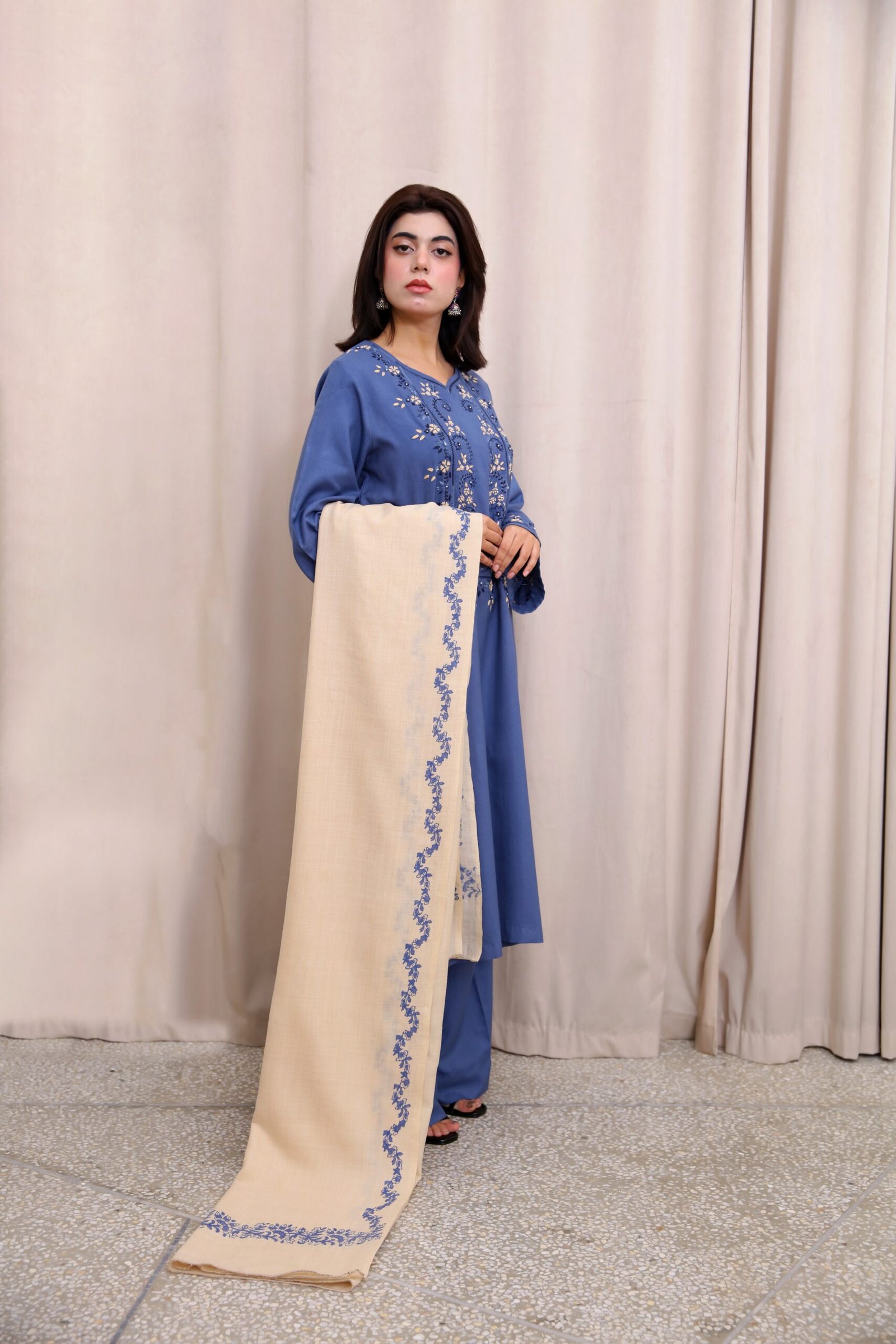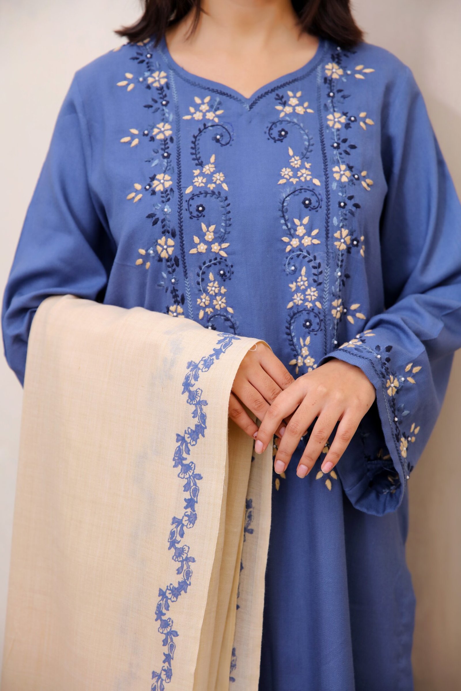 This elegant three-piece suit is crafted in dusty slate blue tone, which has a soft and muted appearance. The article is paired with a soft beige shawl with block prints along borders and length.Â
