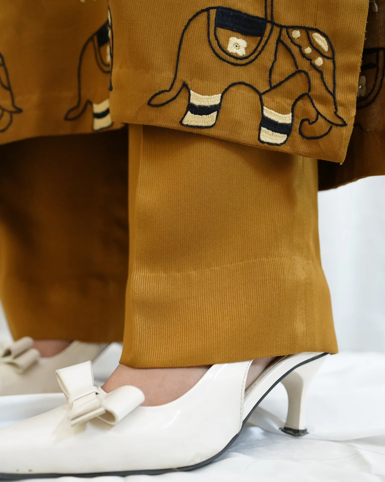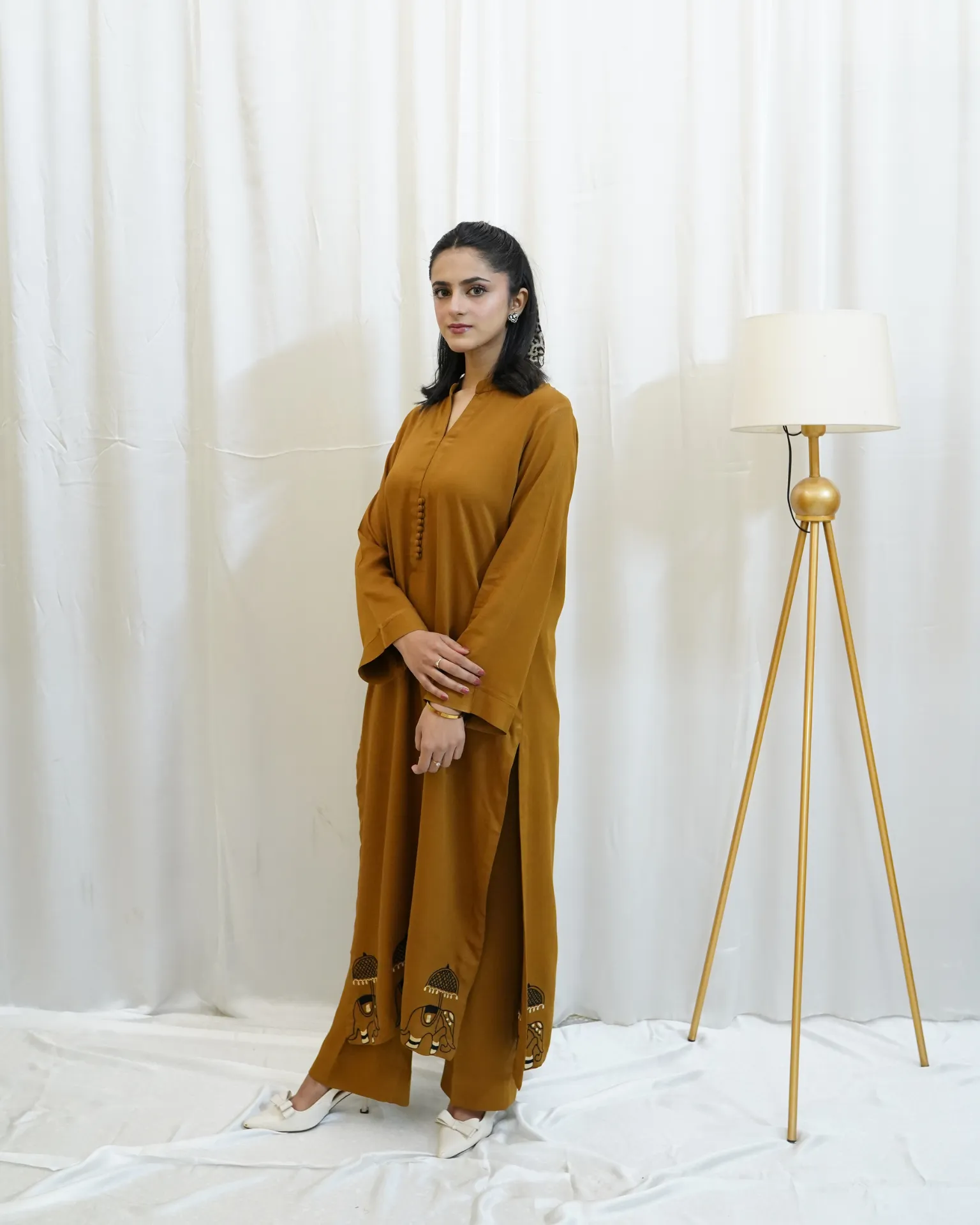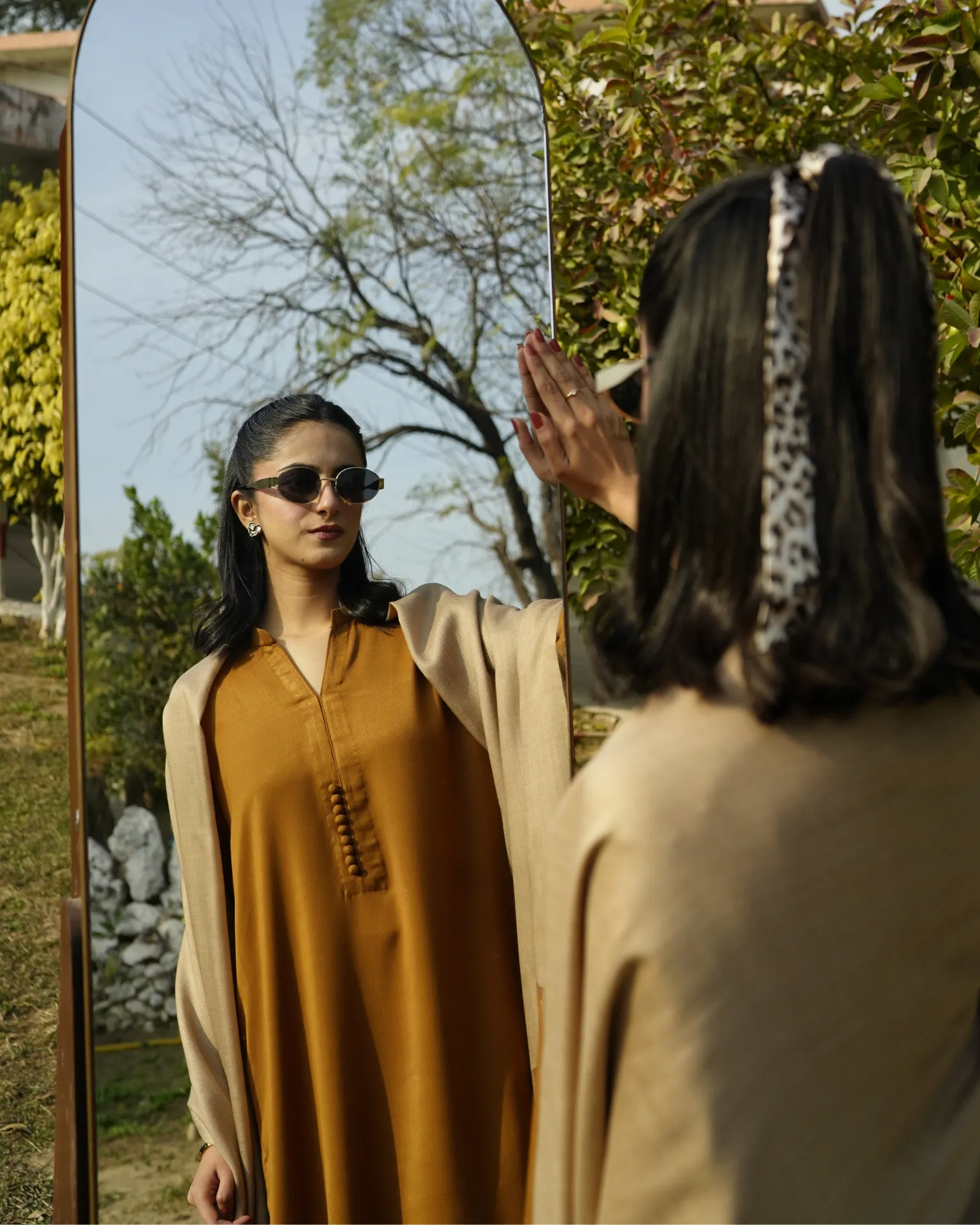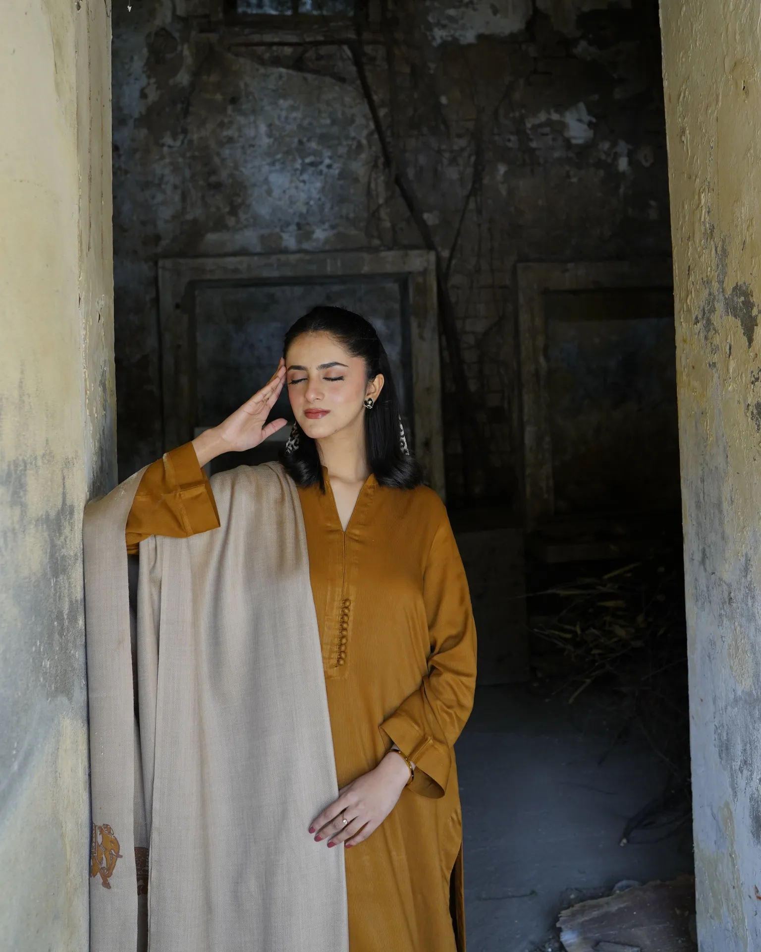 This elegant three-piece suit is crafted in a warm mustard tone, designed to balance simplicity with subtle handcrafted detailing. The long shirt features a straight silhouette with a soft fall, making it comfortable for extended wear while maintaining a graceful structure.