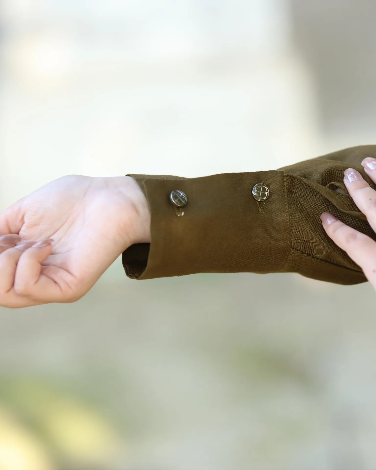 - Front metal button closure with buttonholes (can be styled both closed for a sleek look and opened by pairing with basics)