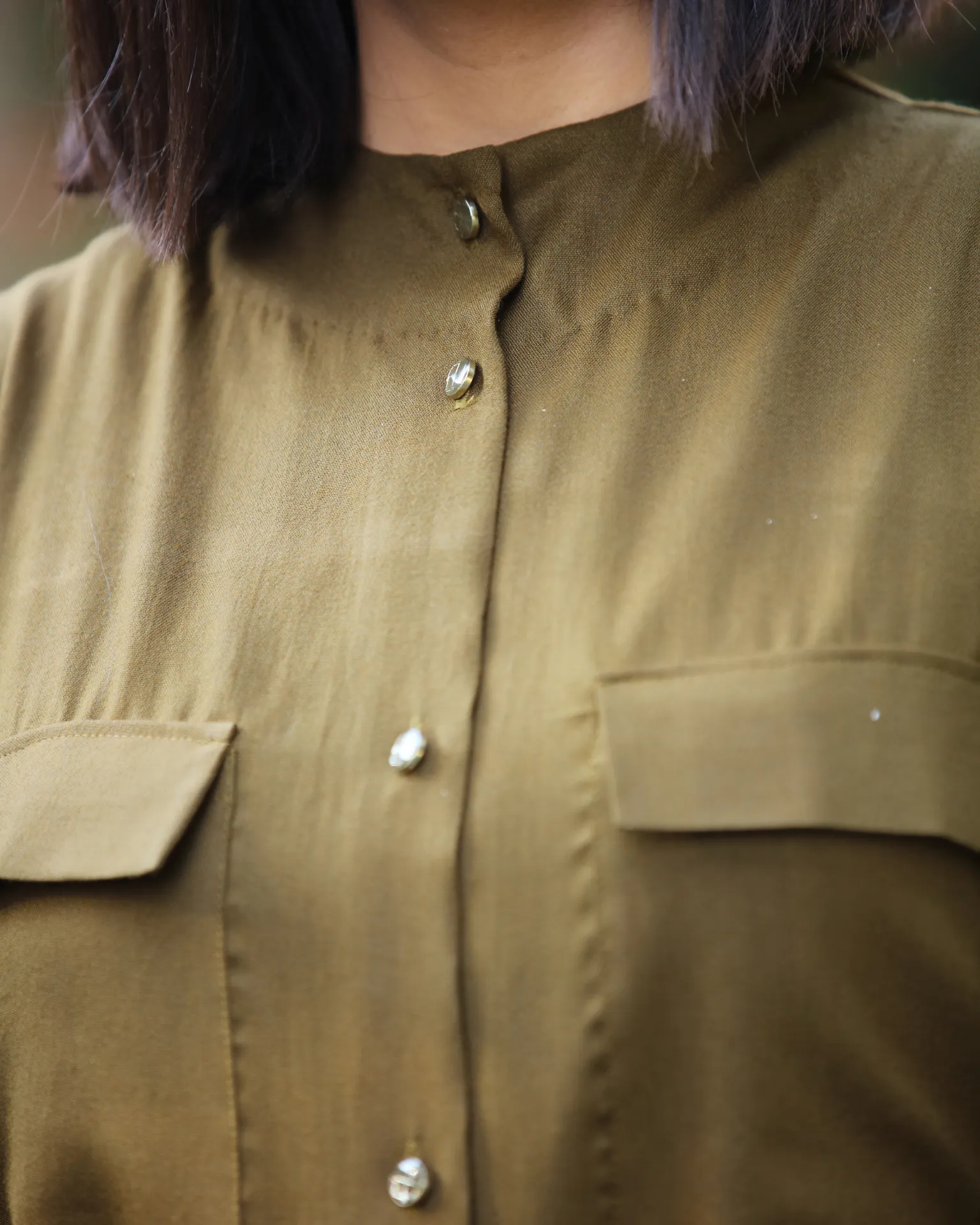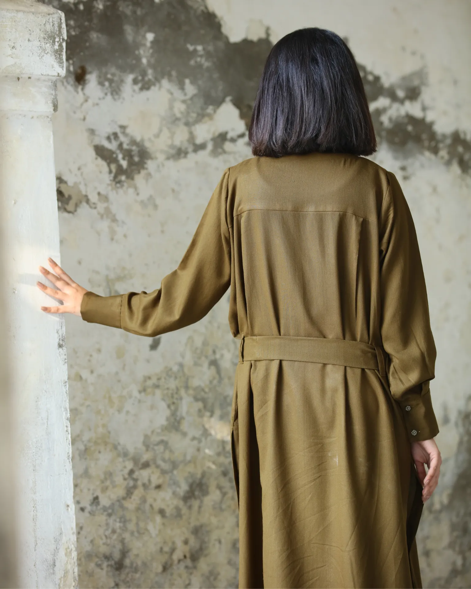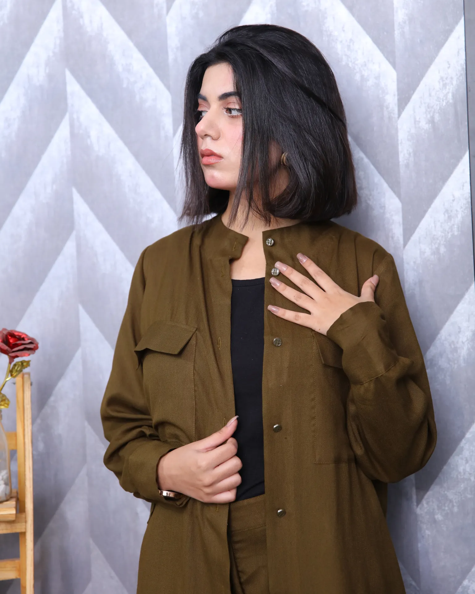 Elevate your winter wardrobe with this Olive green co-ord set, crafted from premium Dhanak Marina fabric which is perfect for both day and evening wear.